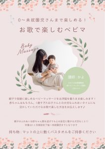 「0歳~未就園児まで楽しめる!お歌で楽しむベビマ」を開催します!講師は元みつる幼稚園教員。現ベビーマッサージ講師の かよ先生です。晴れの場合はお庭でも遊んでいただけます。