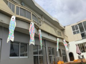 さて、幼稚園では毎年恒例の「こいのぼり」を園庭に出しました。